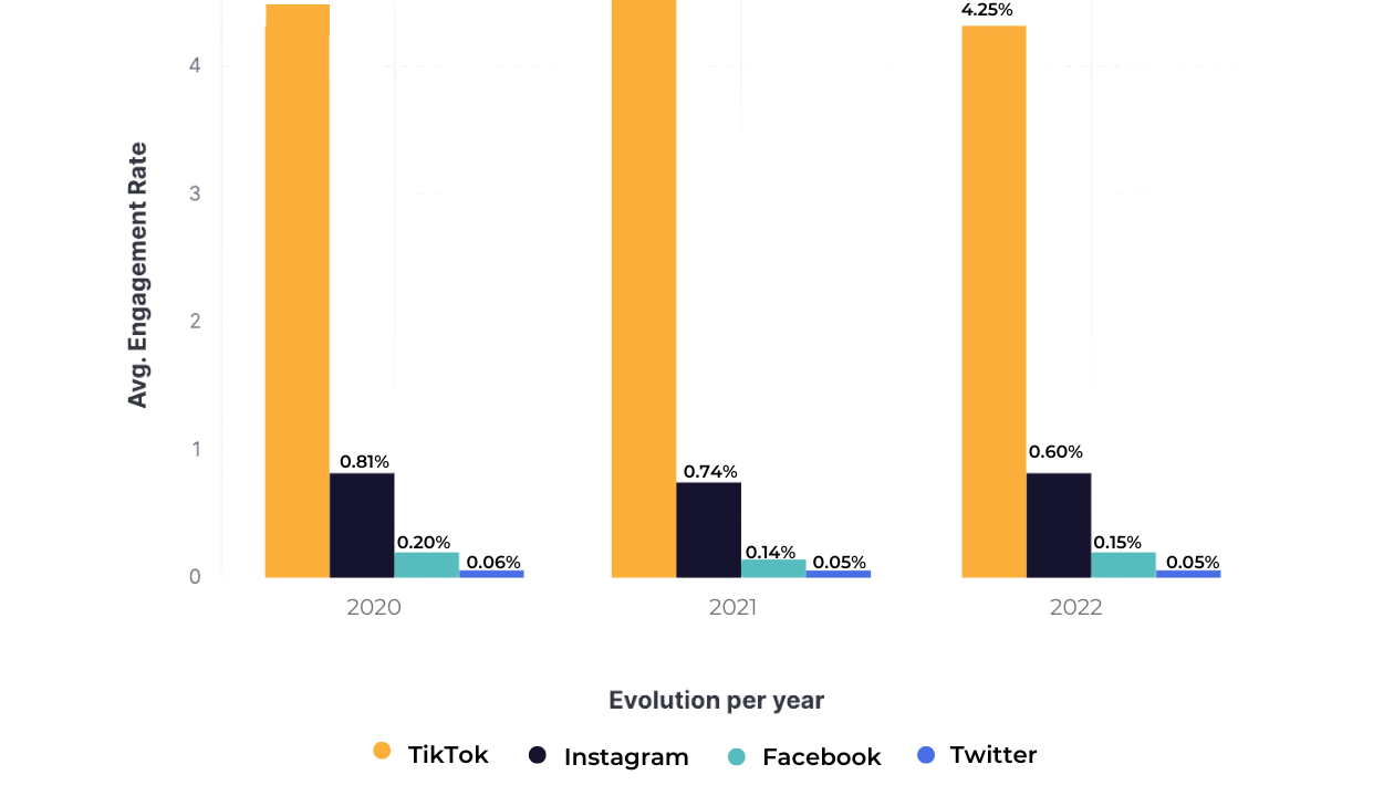 Let’s go back to that vision you had a few moments ago. Your engagement rate is soaring high! That means you’ve struck gold by sharing compelling content that truly connects with your audience. Those likes, comments, and shares are like digital applause, signaling that you’ve won the battle for attention. When it comes to engagement rates, this Social Media Industry Benchmark study shows TikTok leads the pack with an average of 4.24%, followed by Instagram at 0.60% (experiencing a decline) and Facebook at 0.15%. Twitter lags behind with an average engagement rate of 0.05%. A good engagement rate generally falls between 1% to 5%, but it becomes more challenging to achieve as follower count increases. Remember, engagement is the secret sauce of social media success!